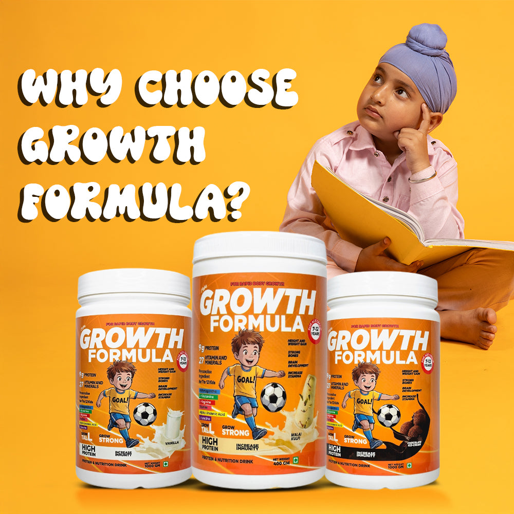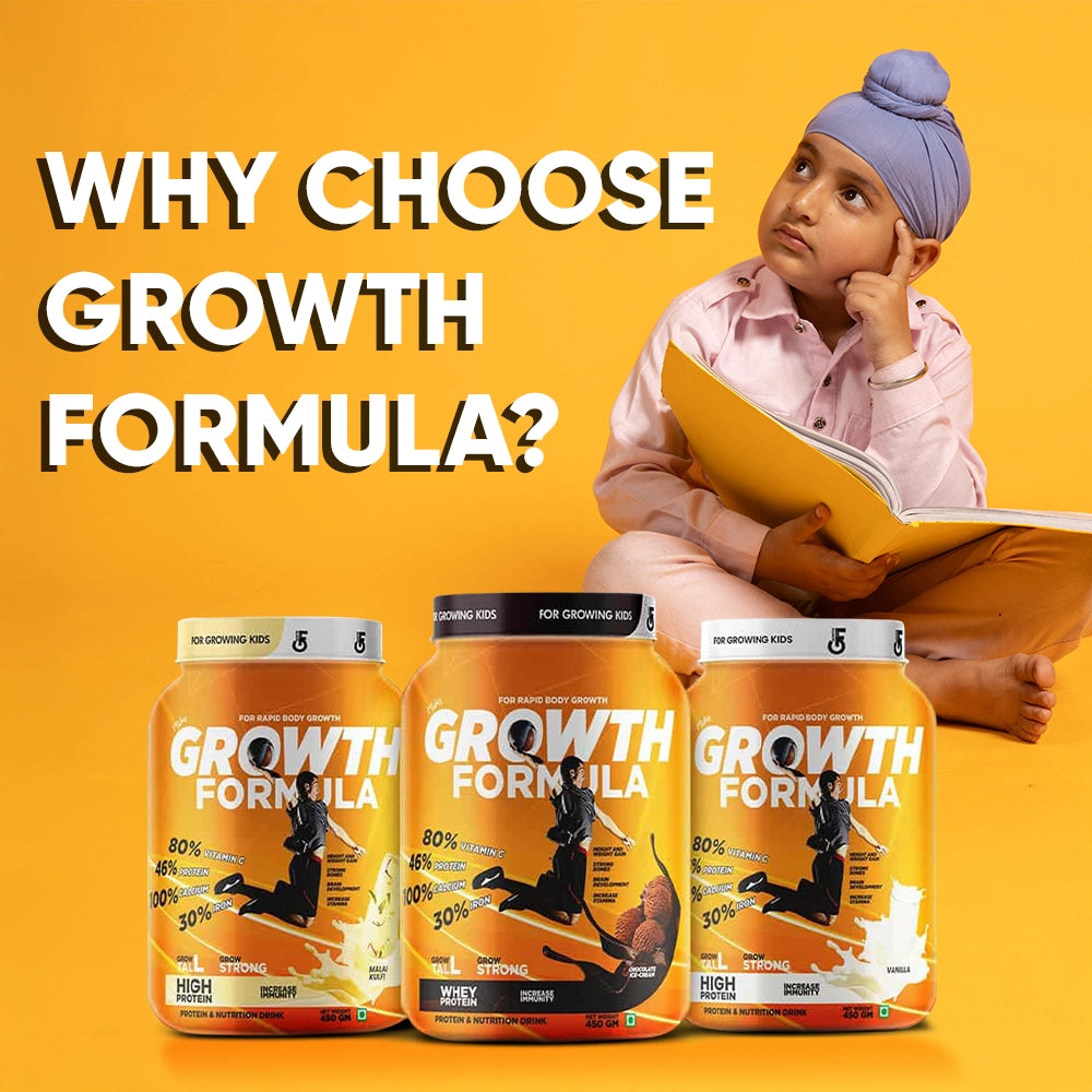 ‘Growth Formula’ is a scientifically designed nutrition powder for kids, enriched with high-quality whey protein, essential vitamins, and minerals to support height, strength, brain development, and overall growth.